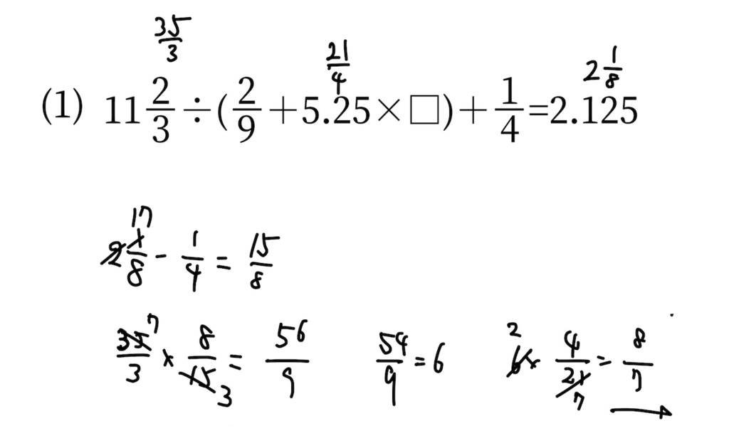 いかがでしょうか。 計算の順番を完全に理解していると、番号を書くのが面倒になりますから、このようにどの部分がいくつになるかをメモしながら解き進めるようになります。 ここまでくると、「計算くらぶ」のガチ計算レベルを毎日のルーティンとして取り入れることができ、入試レベルにも対応ができるようになっていきます。