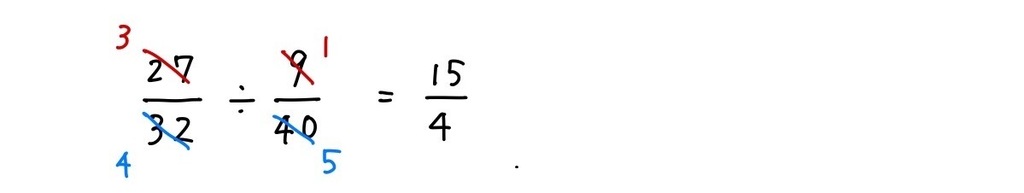③分子は、 3×5 = 15, 分母は、 4×1 = 4 と、頭の中で後ろの分数をひっくり返してかけ算する